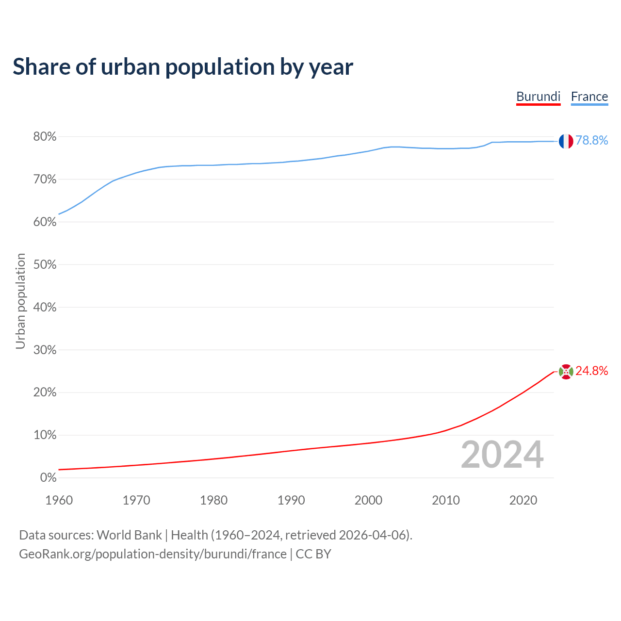 From 2004 to 2024, the share of urban population changed from 8.92% to 24.8% in Burundi and from 77.5% to 78.8% in France.