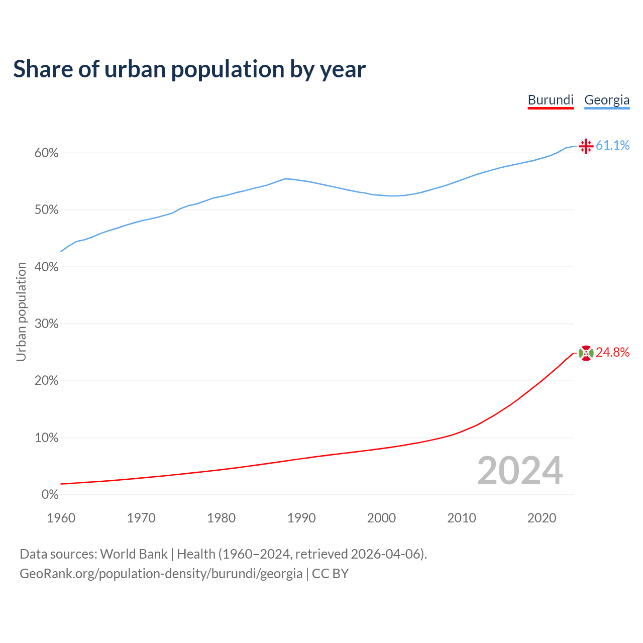 From 2004 to 2024, the share of urban population changed from 8.92% to 24.8% in Burundi and from 52.7% to 61.1% in Georgia.