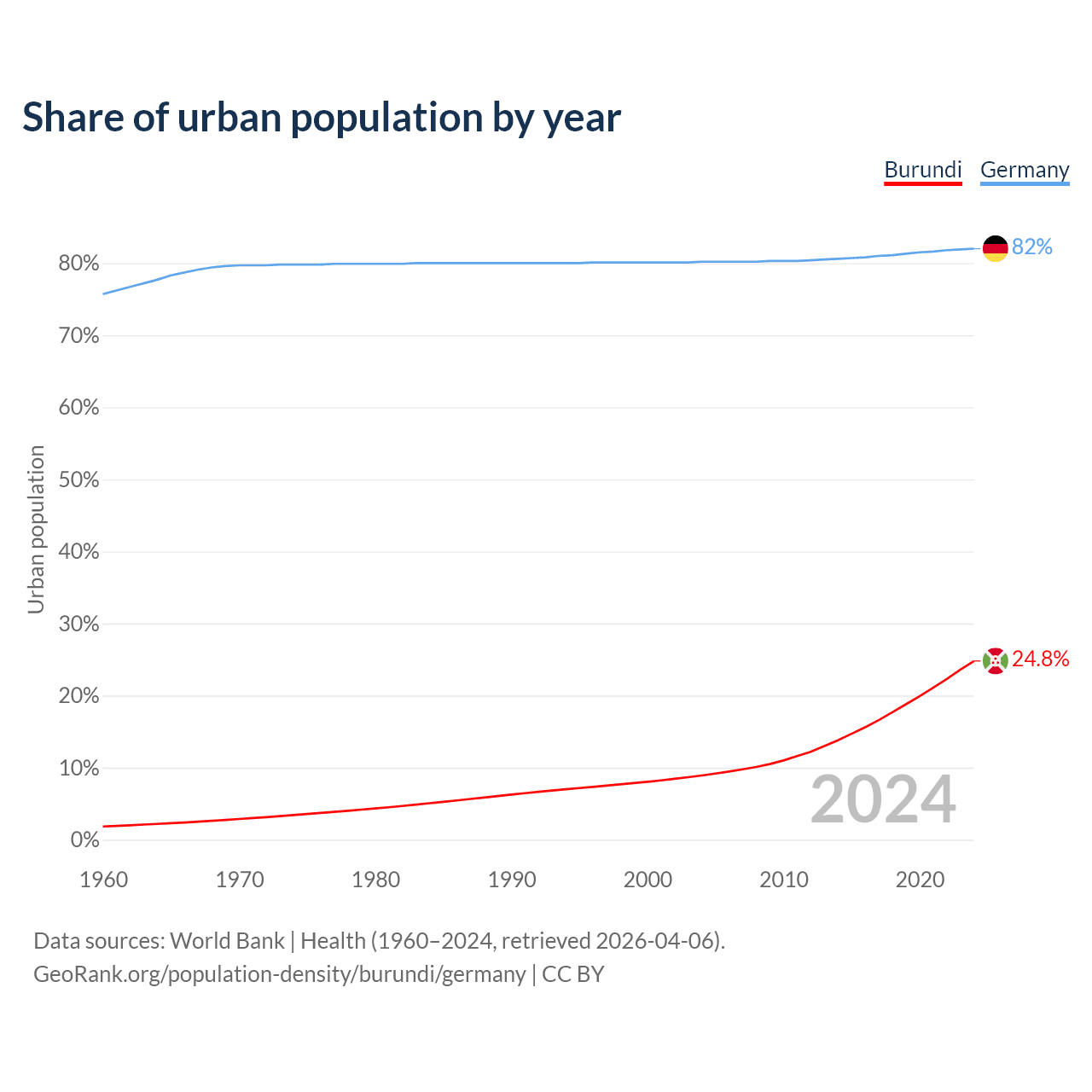 From 2004 to 2024, the share of urban population changed from 8.92% to 24.8% in Burundi and from 80.2% to 82% in Germany.