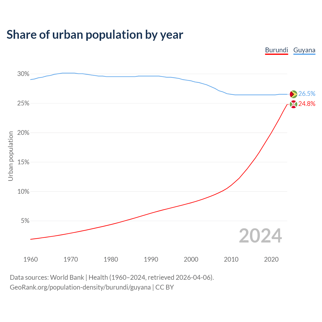 From 2004 to 2024, the share of urban population changed from 8.92% to 24.8% in Burundi and from 28.1% to 26.5% in Guyana.
