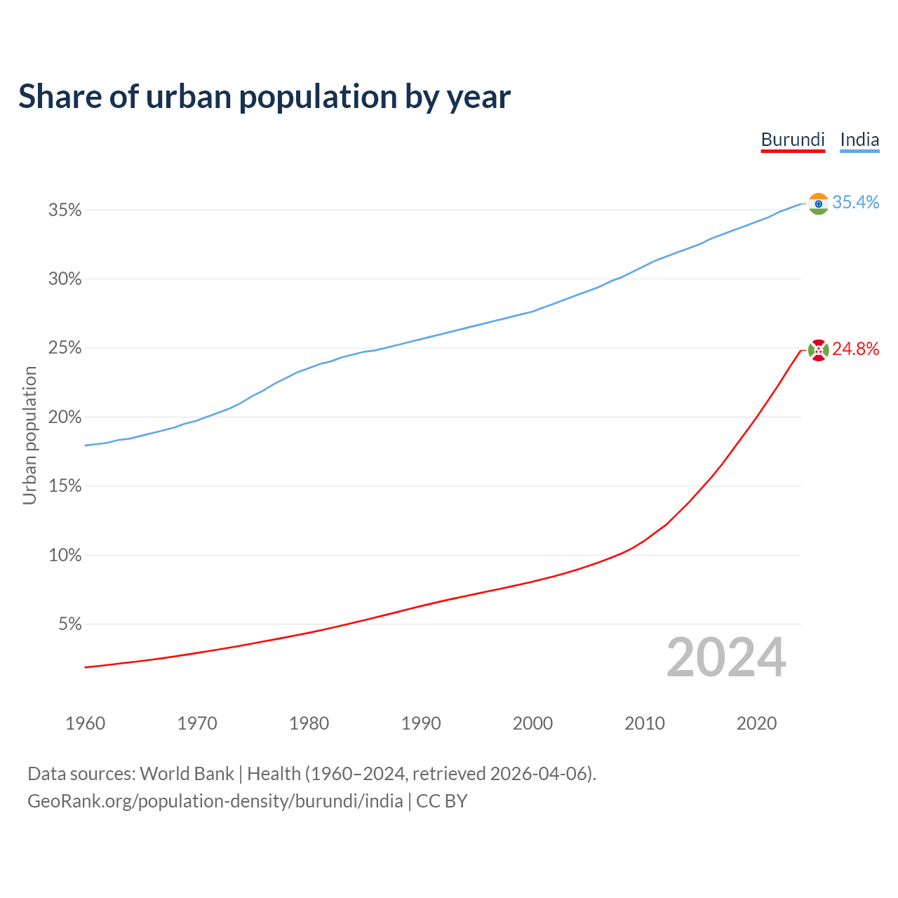 From 2004 to 2024, the share of urban population changed from 8.92% to 24.8% in Burundi and from 28.8% to 35.4% in India.
