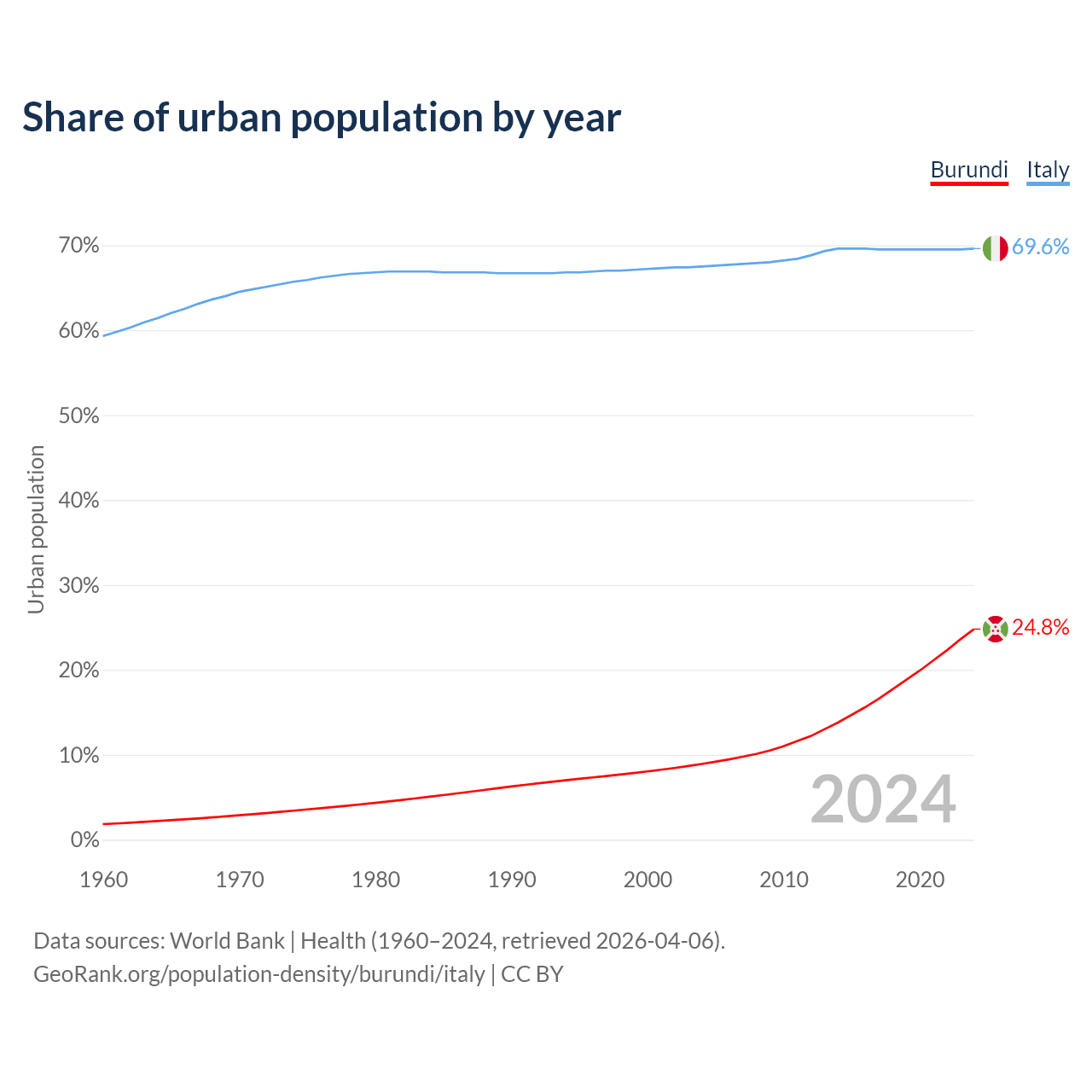 From 2004 to 2024, the share of urban population changed from 8.92% to 24.8% in Burundi and from 67.5% to 69.6% in Italy.