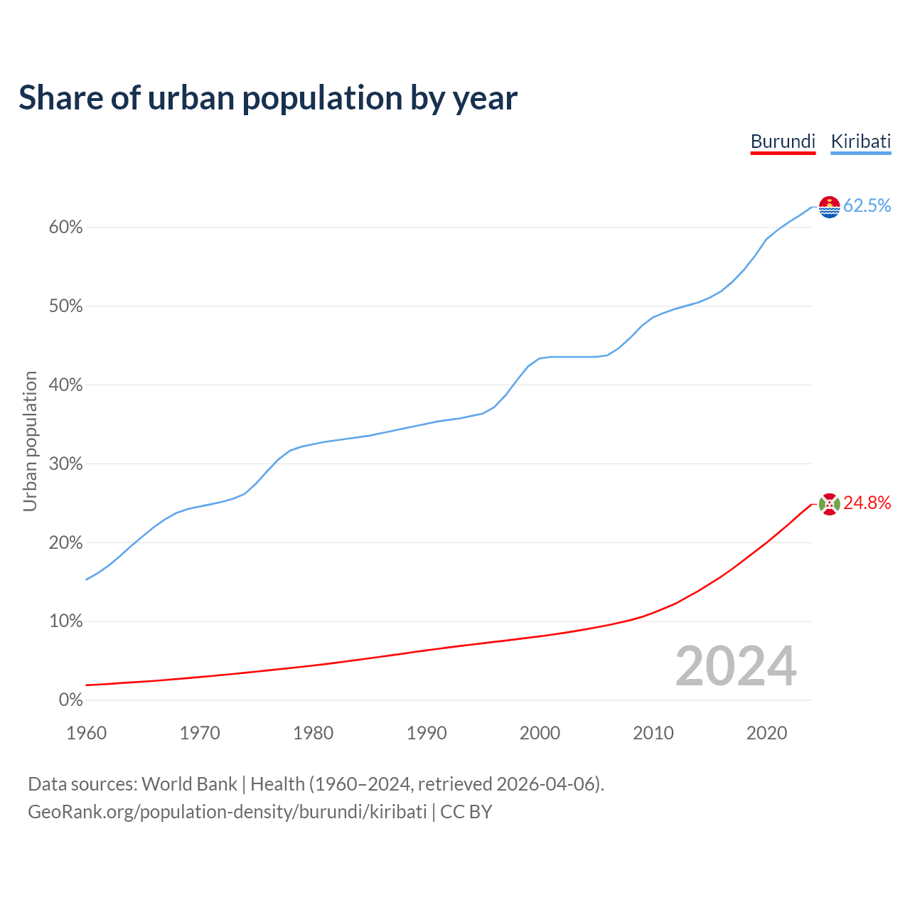 From 2004 to 2024, the share of urban population changed from 8.92% to 24.8% in Burundi and from 43.5% to 62.5% in Kiribati.