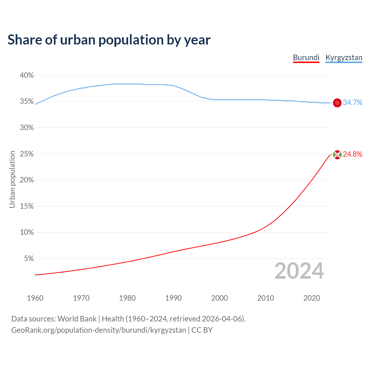 From 2004 to 2024, the share of urban population changed from 8.92% to 24.8% in Burundi and from 35.3% to 34.7% in Kyrgyzstan.