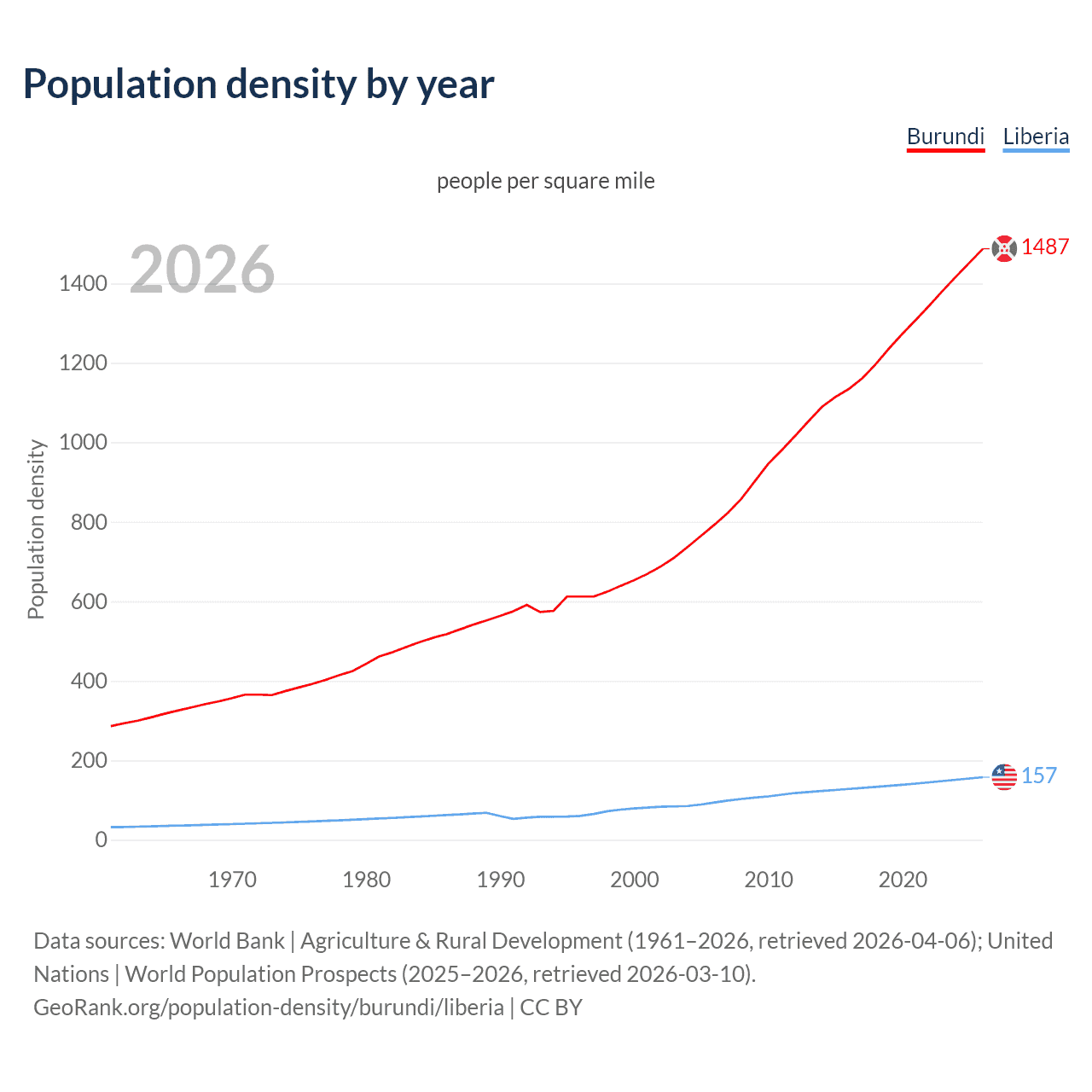 From 2006 to 2026, population density in Burundi increased by 87.4%, compared to a 67.6% growth in Liberia.
