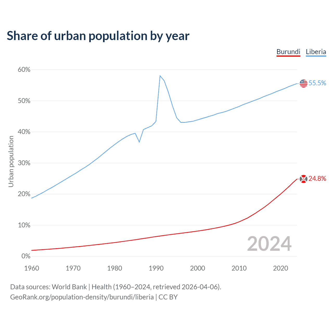 From 2004 to 2024, the share of urban population changed from 8.92% to 24.8% in Burundi and from 45.4% to 55.5% in Liberia.