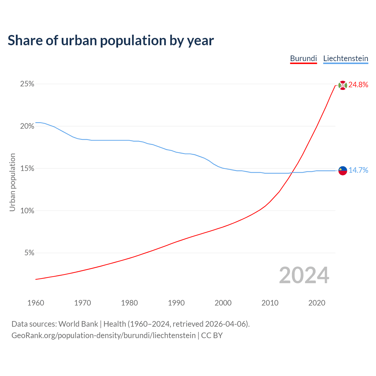 From 2004 to 2024, the share of urban population changed from 8.92% to 24.8% in Burundi and from 14.7% to 14.7% in Liechtenstein.
