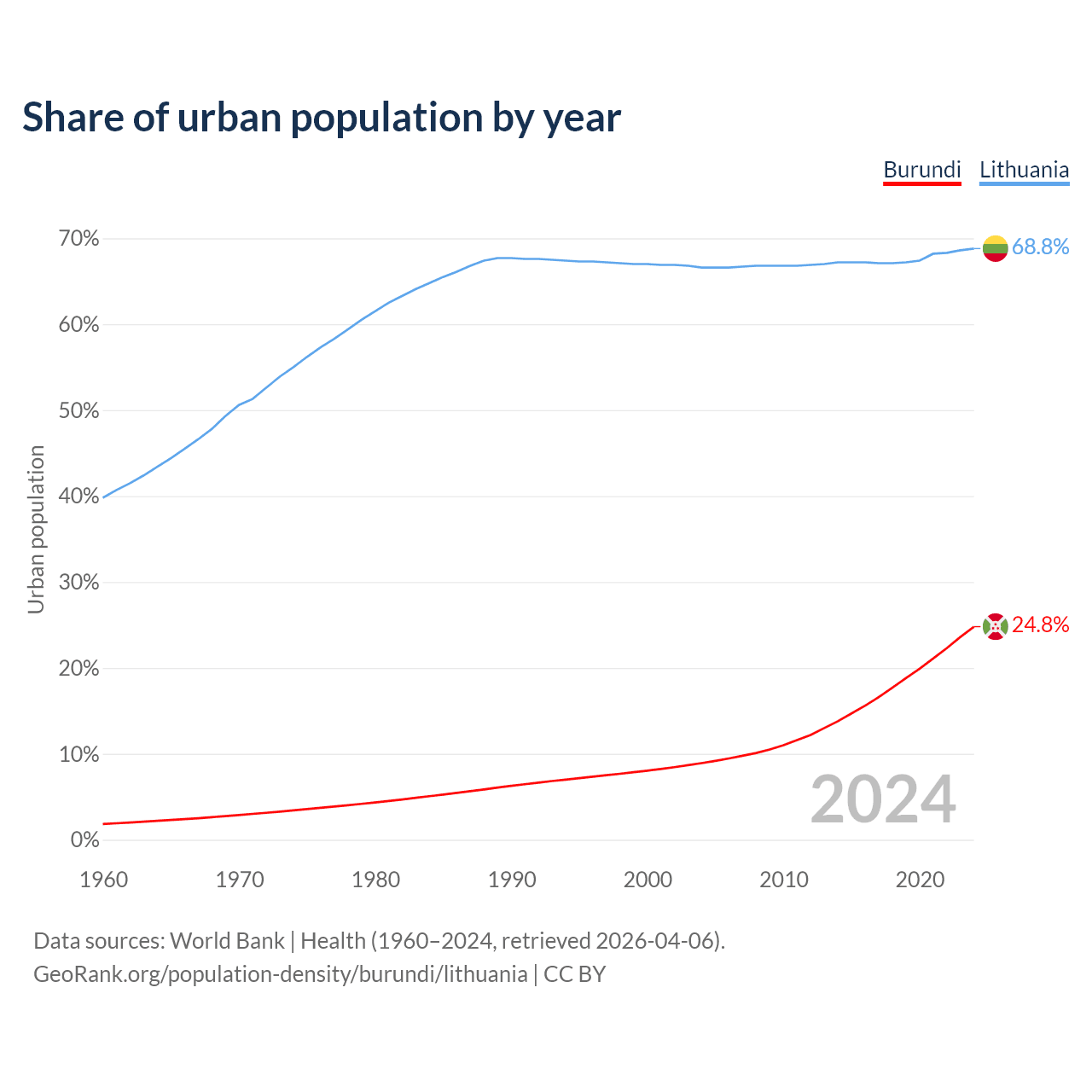From 2004 to 2024, the share of urban population changed from 8.92% to 24.8% in Burundi and from 66.6% to 68.8% in Lithuania.