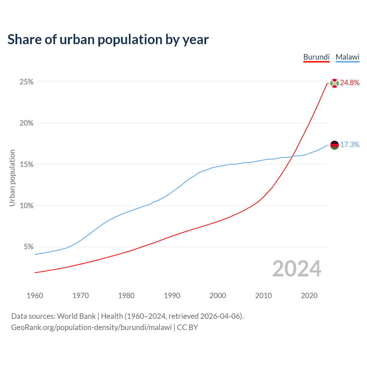 From 2004 to 2024, the share of urban population changed from 8.92% to 24.8% in Burundi and from 15% to 17.3% in Malawi.