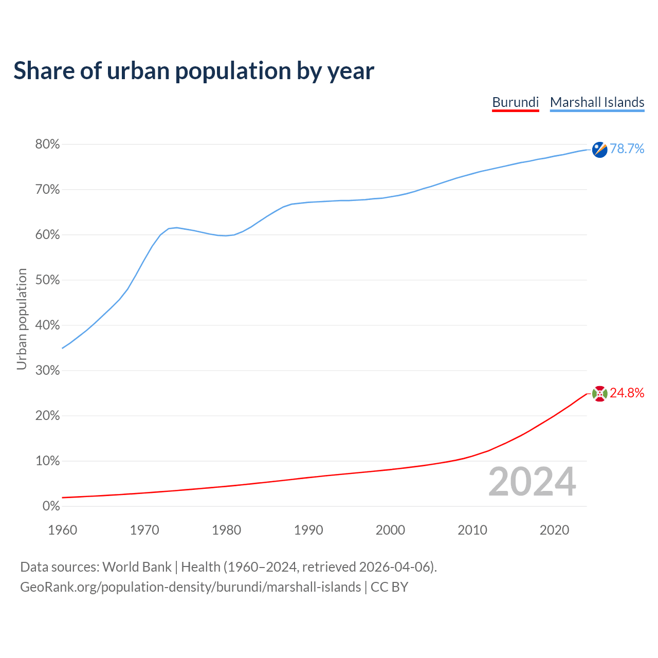 From 2004 to 2024, the share of urban population changed from 8.92% to 24.8% in Burundi and from 70.1% to 78.7% in the Marshall Islands.