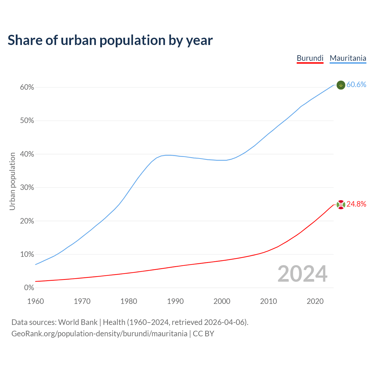 From 2004 to 2024, the share of urban population changed from 8.92% to 24.8% in Burundi and from 39.6% to 60.6% in Mauritania.