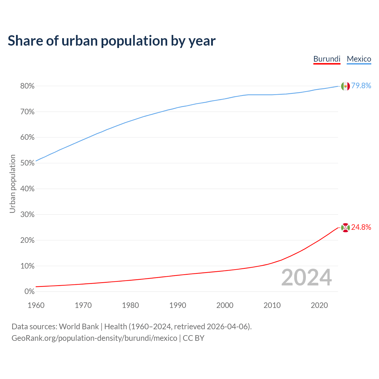 From 2004 to 2024, the share of urban population changed from 8.92% to 24.8% in Burundi and from 76.3% to 79.8% in Mexico.