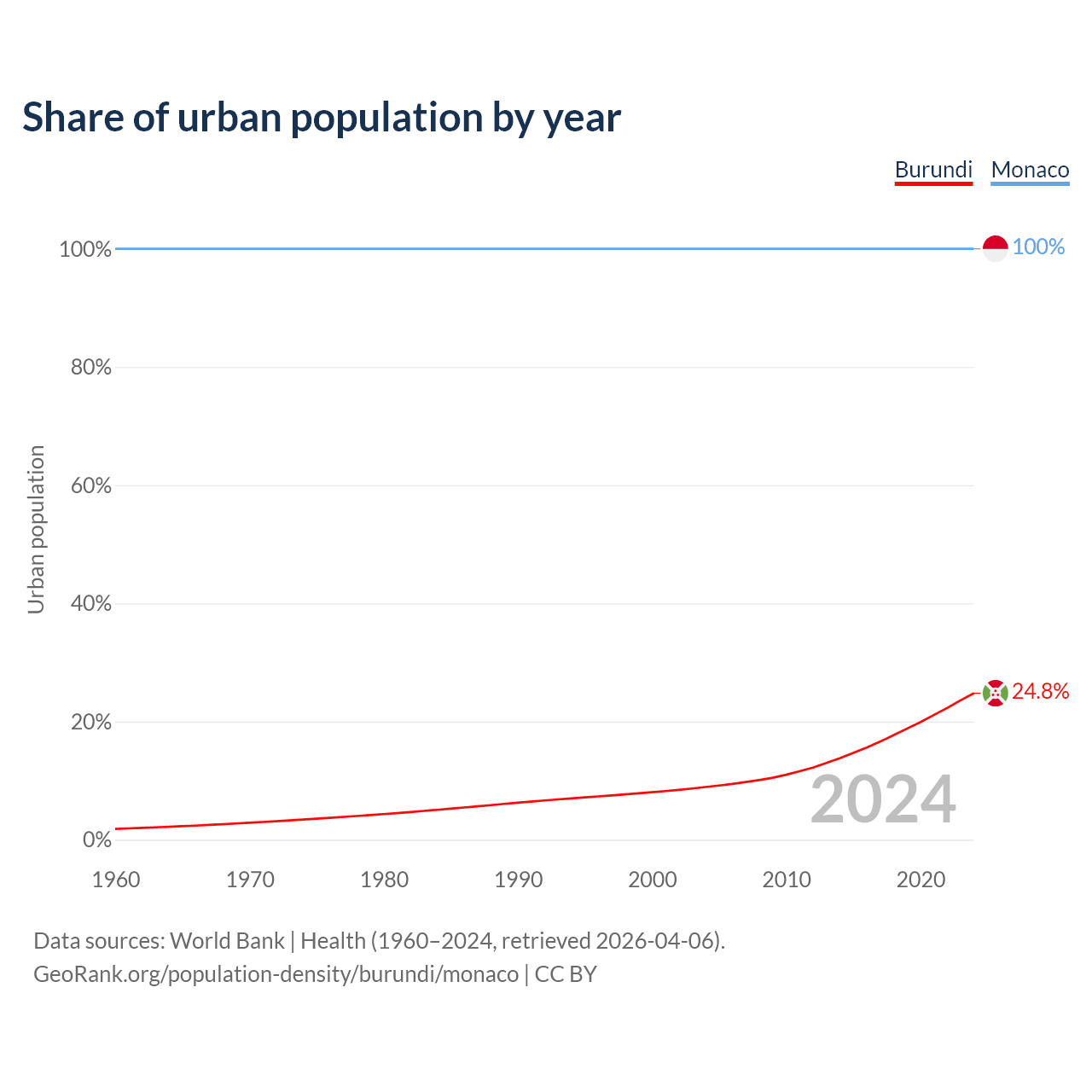 From 2004 to 2024, the share of urban population changed from 8.92% to 24.8% in Burundi and from 100% to 100% in Monaco.