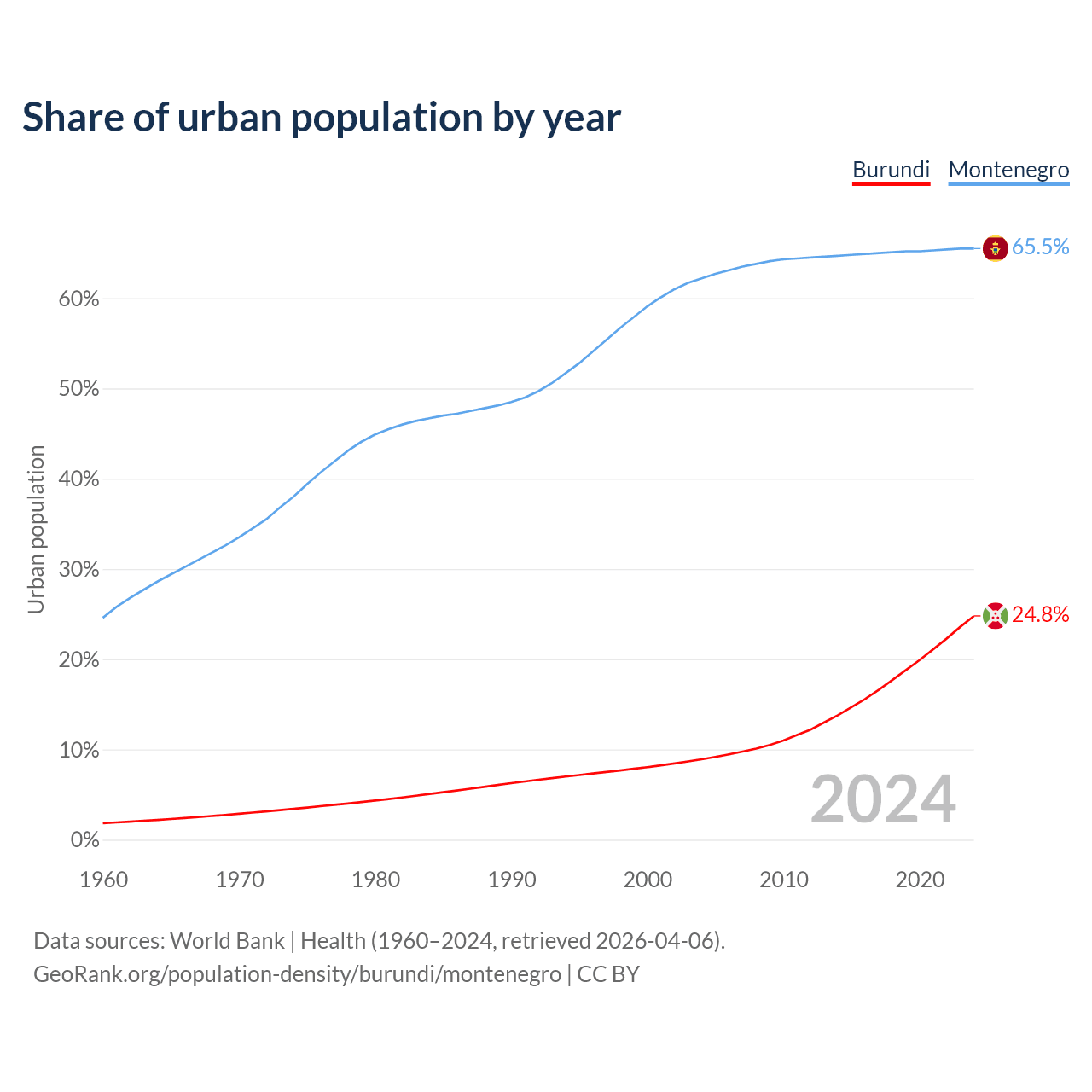 From 2004 to 2024, the share of urban population changed from 8.92% to 24.8% in Burundi and from 62.2% to 65.5% in Montenegro.