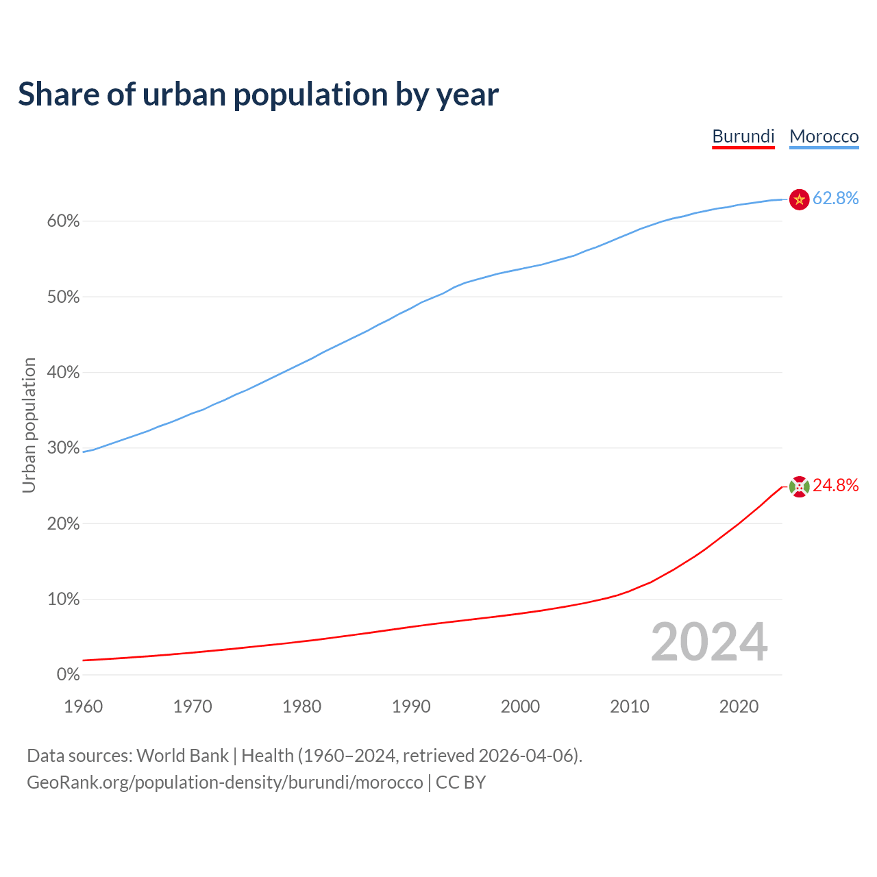 From 2004 to 2024, the share of urban population changed from 8.92% to 24.8% in Burundi and from 55% to 62.8% in Morocco.