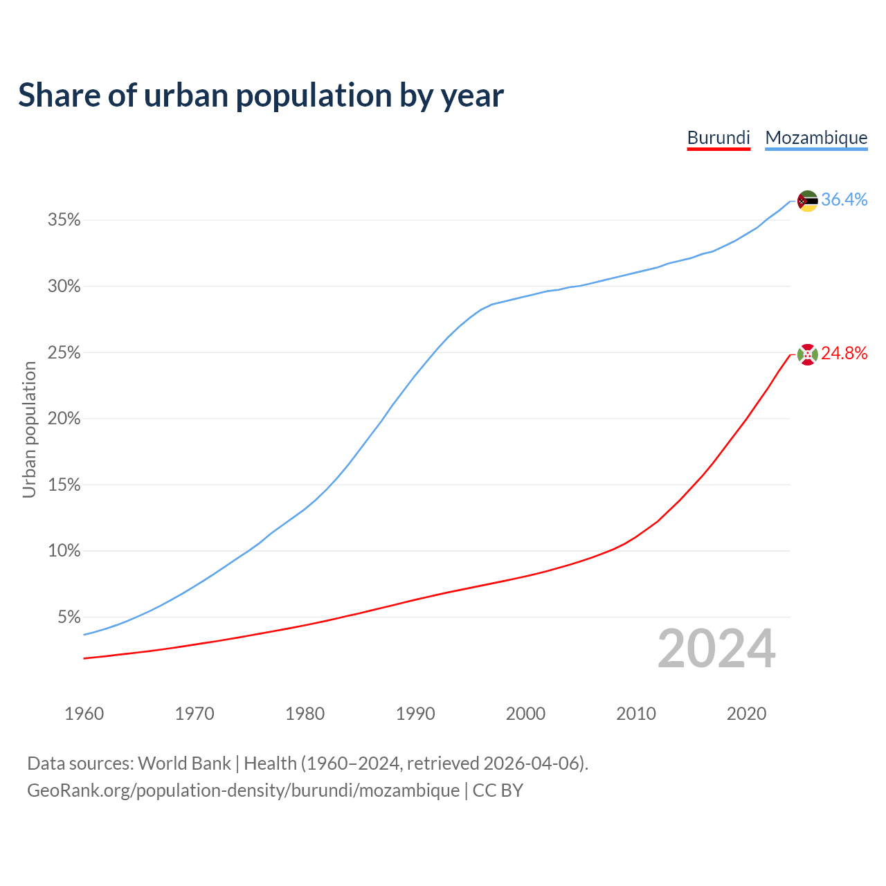 From 2006 to 2026, population density in Burundi increased by 87.4%, compared to a 76.4% growth in Mozambique.