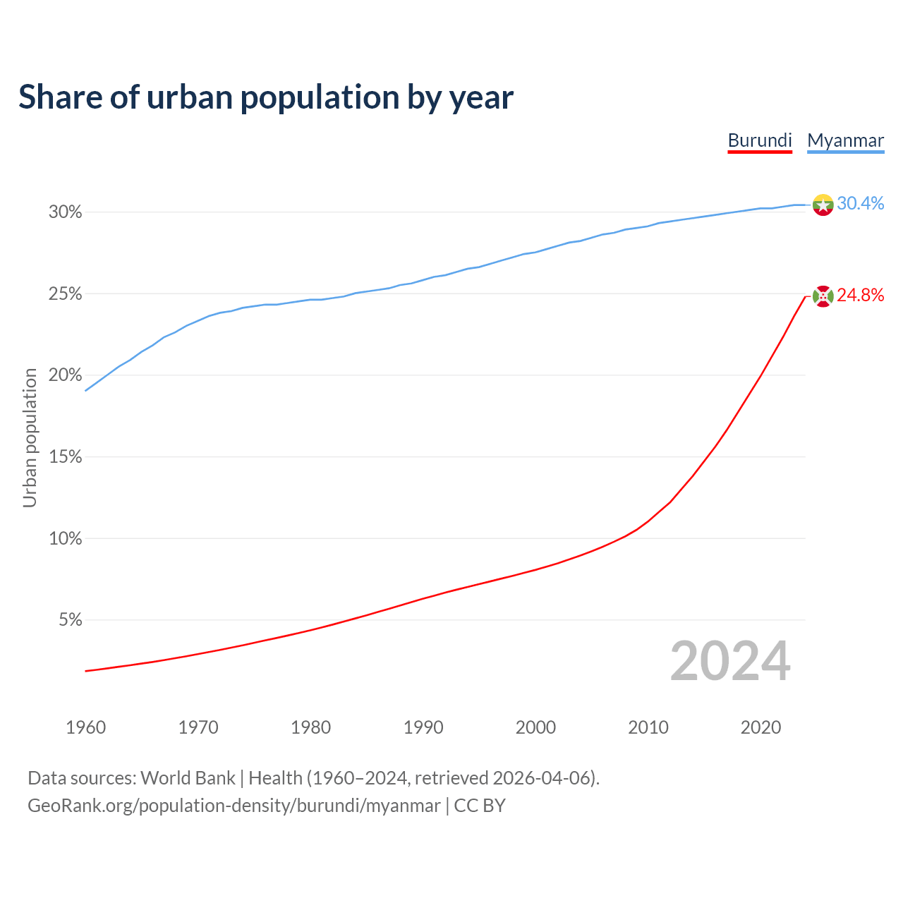 From 2004 to 2024, the share of urban population changed from 8.92% to 24.8% in Burundi and from 28.2% to 30.4% in Myanmar.