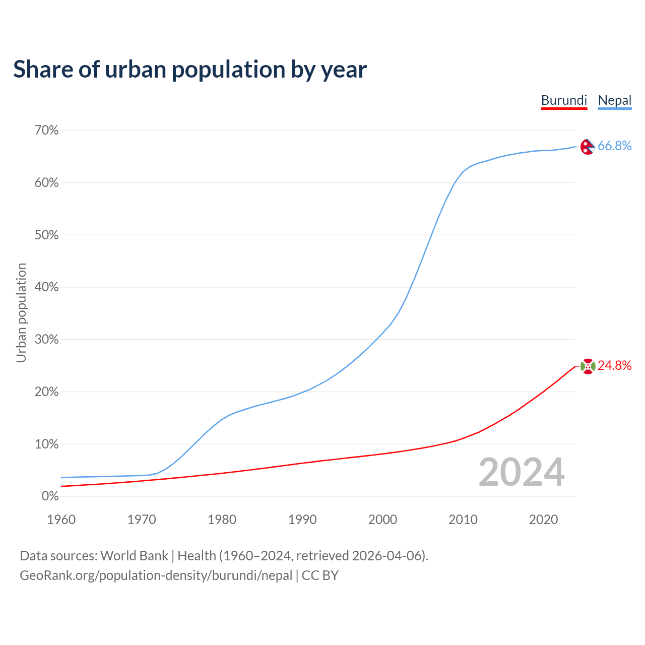 From 2004 to 2024, the share of urban population changed from 8.92% to 24.8% in Burundi and from 41.6% to 66.8% in Nepal.