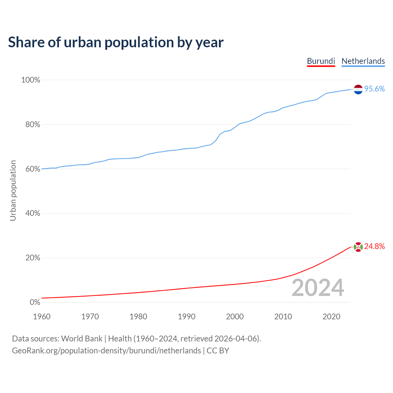 From 2004 to 2024, the share of urban population changed from 8.92% to 24.8% in Burundi and from 82.3% to 95.6% in the Netherlands.