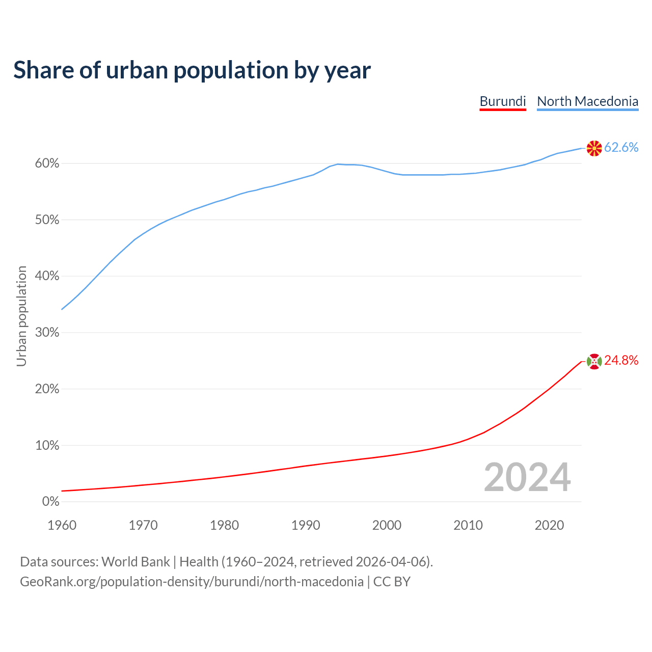 From 2004 to 2024, the share of urban population changed from 8.92% to 24.8% in Burundi and from 57.9% to 62.6% in North Macedonia.