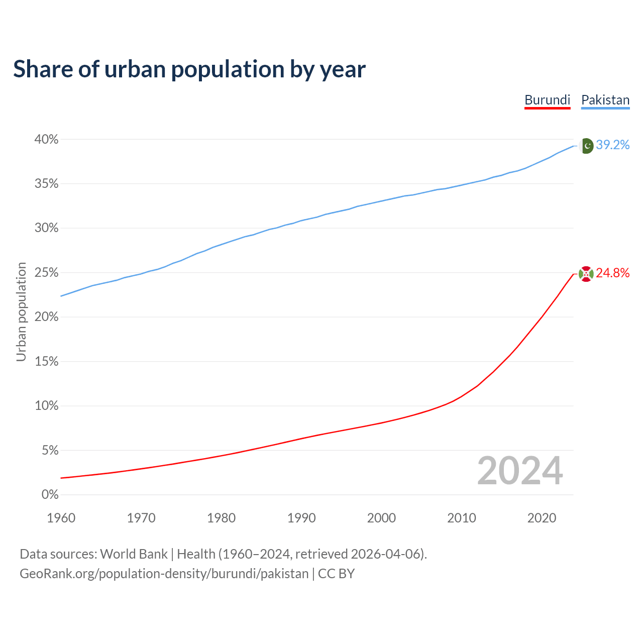 From 2004 to 2024, the share of urban population changed from 8.92% to 24.8% in Burundi and from 33.7% to 39.2% in Pakistan.