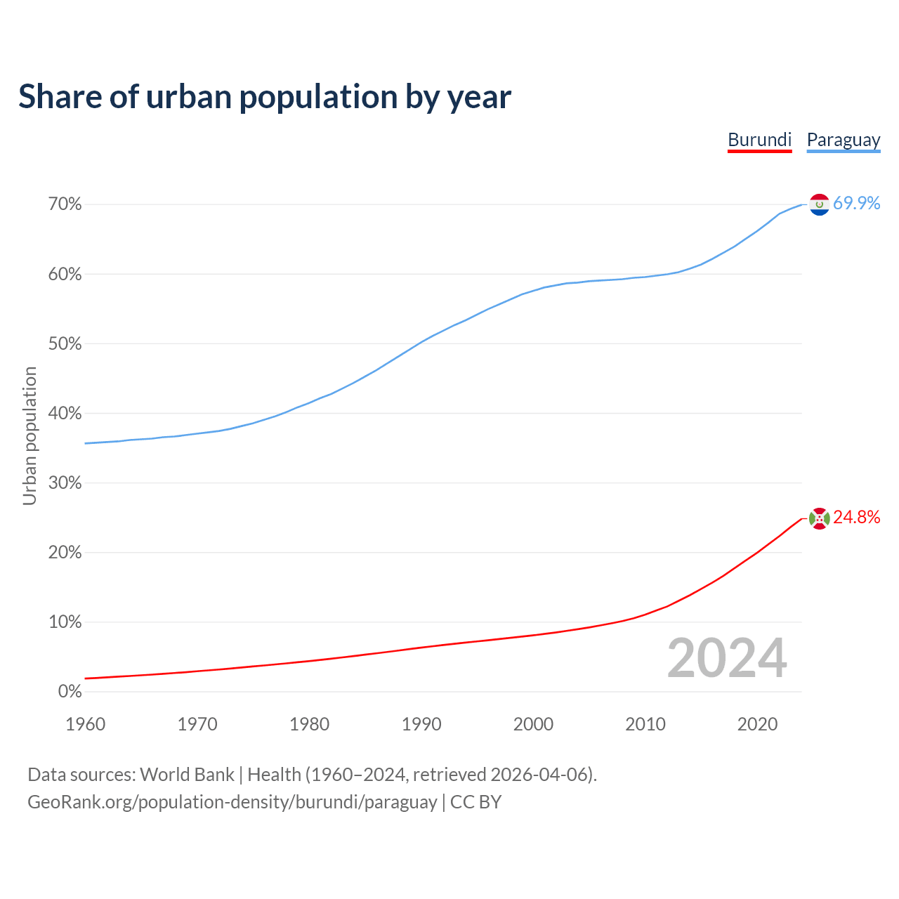 From 2004 to 2024, the share of urban population changed from 8.92% to 24.8% in Burundi and from 58.7% to 69.9% in Paraguay.
