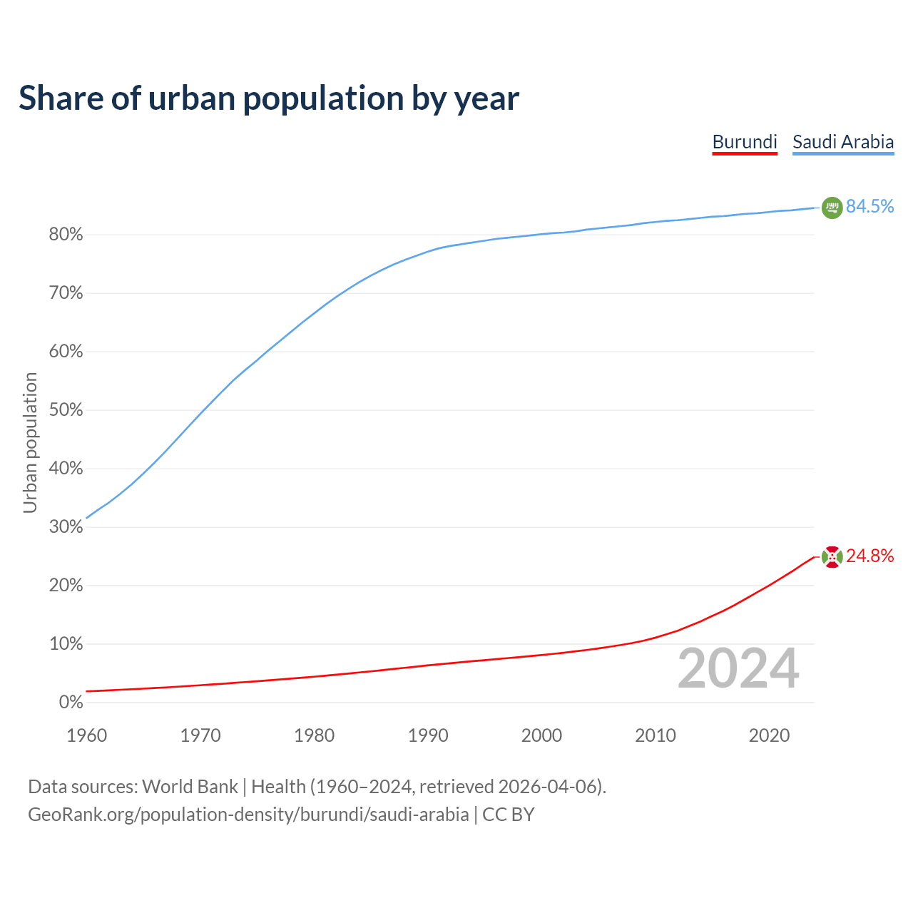 From 2004 to 2024, the share of urban population changed from 8.92% to 24.8% in Burundi and from 80.8% to 84.5% in Saudi Arabia.