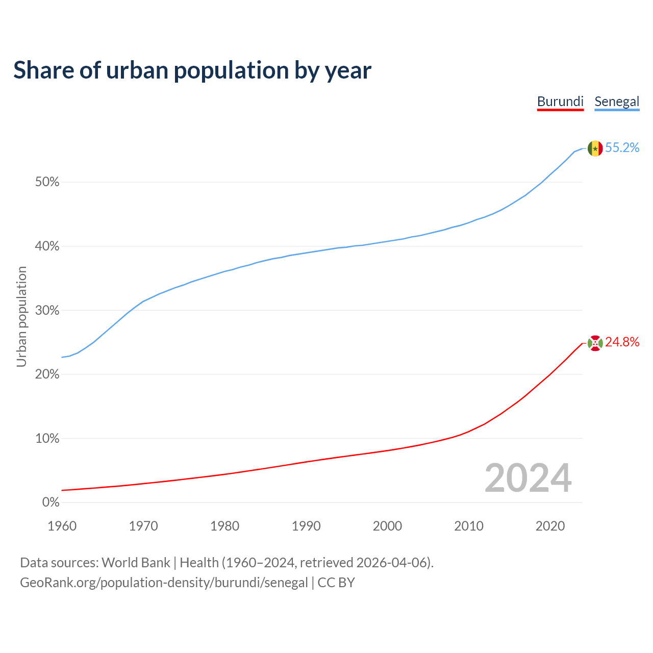 From 2004 to 2024, the share of urban population changed from 8.92% to 24.8% in Burundi and from 41.6% to 55.2% in Senegal.