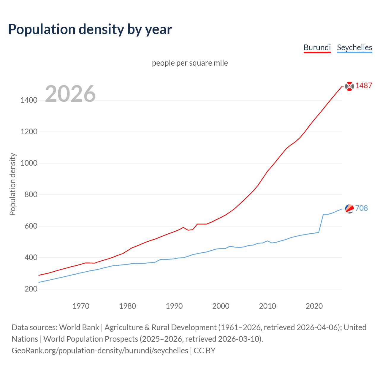 From 2006 to 2026, population density in Burundi increased by 87.4%, compared to a 48.7% growth in the Seychelles.