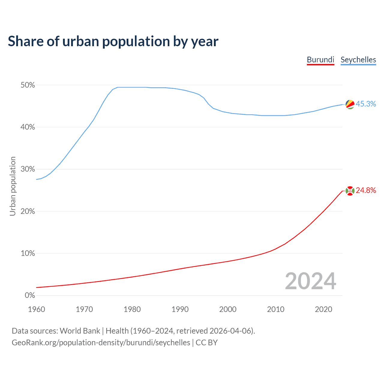 From 2004 to 2024, the share of urban population changed from 8.92% to 24.8% in Burundi and from 42.9% to 45.3% in the Seychelles.