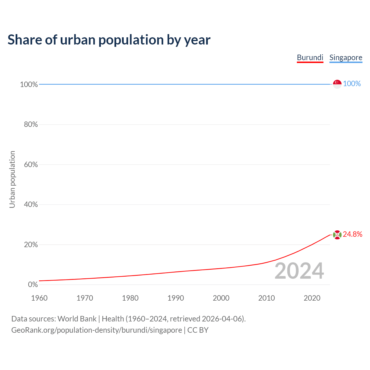 From 2004 to 2024, the share of urban population changed from 8.92% to 24.8% in Burundi and from 100% to 100% in Singapore.