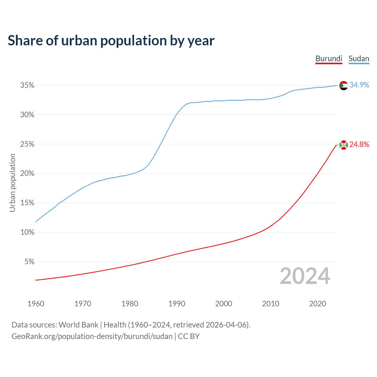 From 2004 to 2024, the share of urban population changed from 8.92% to 24.8% in Burundi and from 32.4% to 34.9% in Sudan.