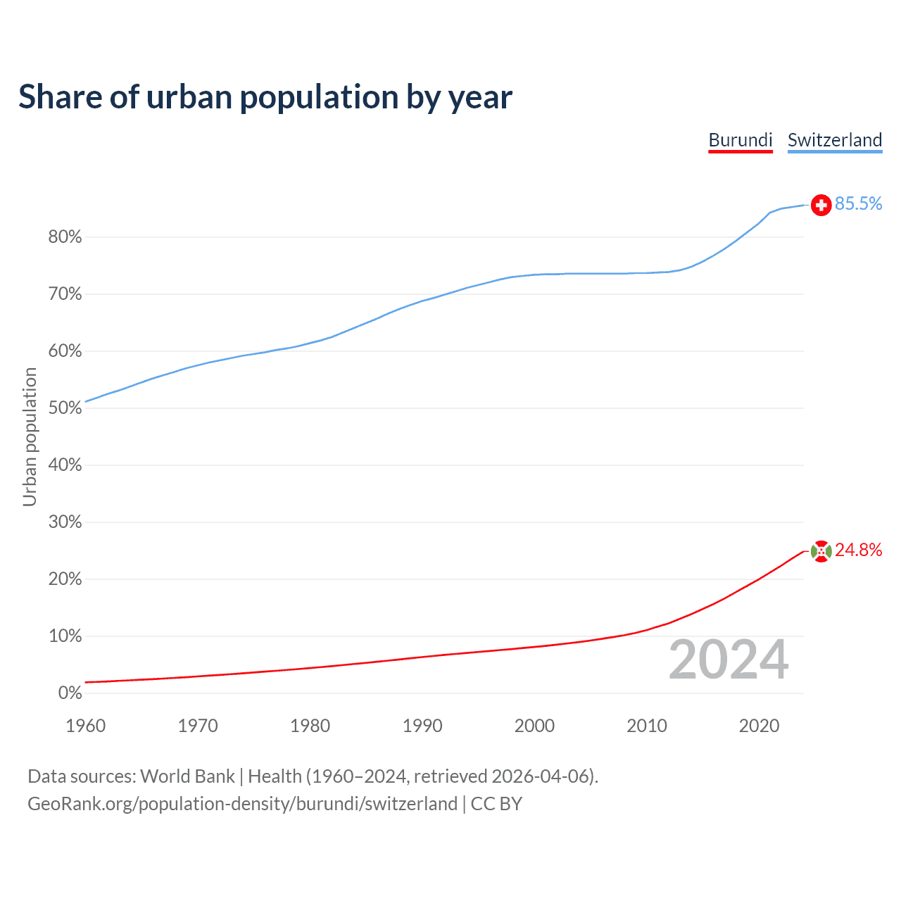 From 2004 to 2024, the share of urban population changed from 8.92% to 24.8% in Burundi and from 73.5% to 85.5% in Switzerland.