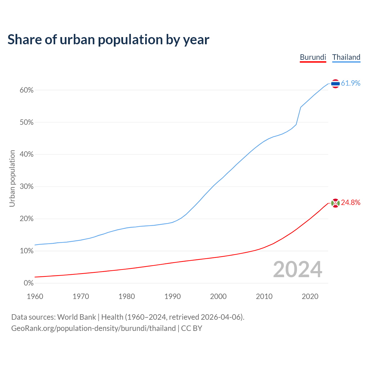 From 2004 to 2024, the share of urban population changed from 8.92% to 24.8% in Burundi and from 36.8% to 61.9% in Thailand.