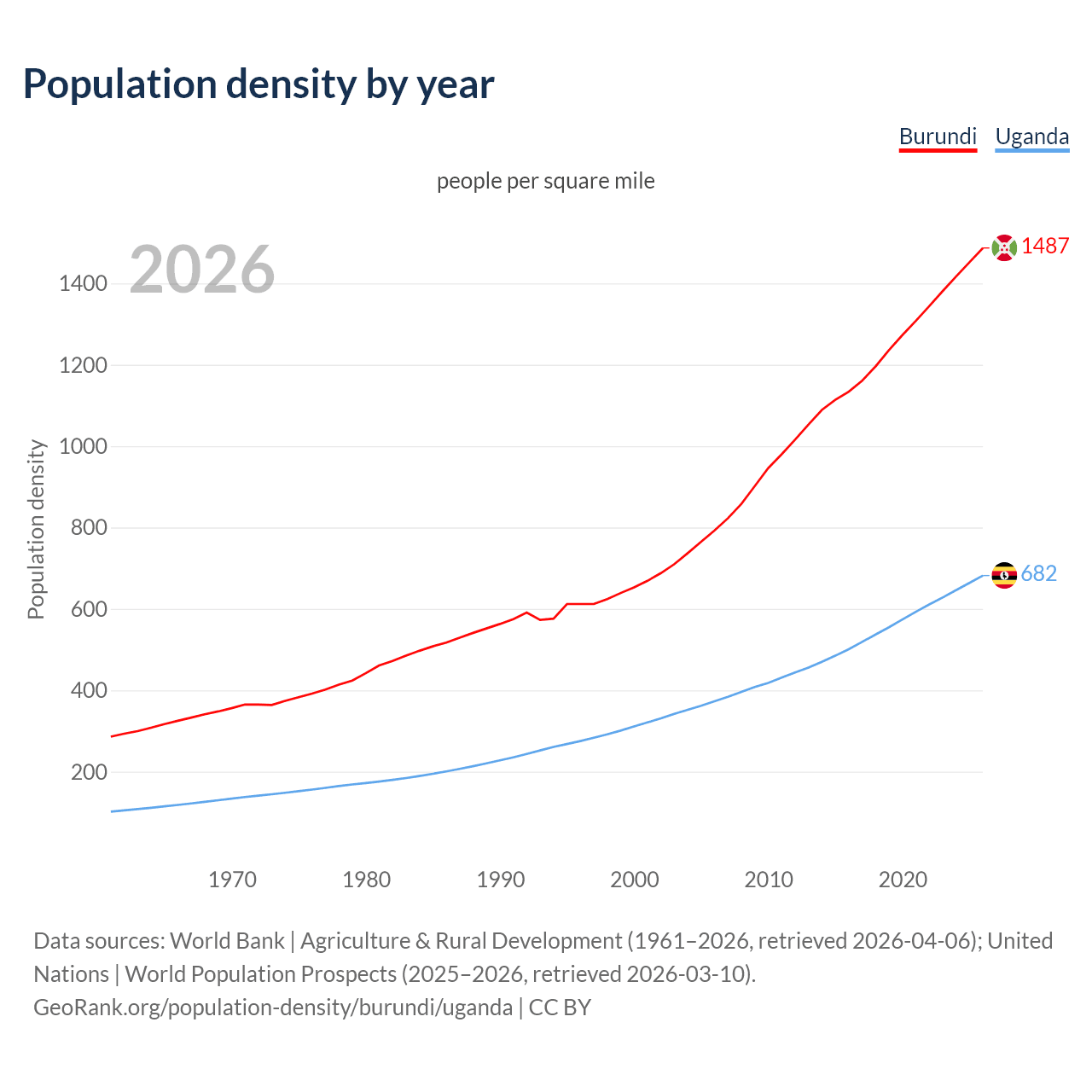 From 2006 to 2026, population density in Burundi increased by 87.4%, compared to a 82.7% growth in Uganda.