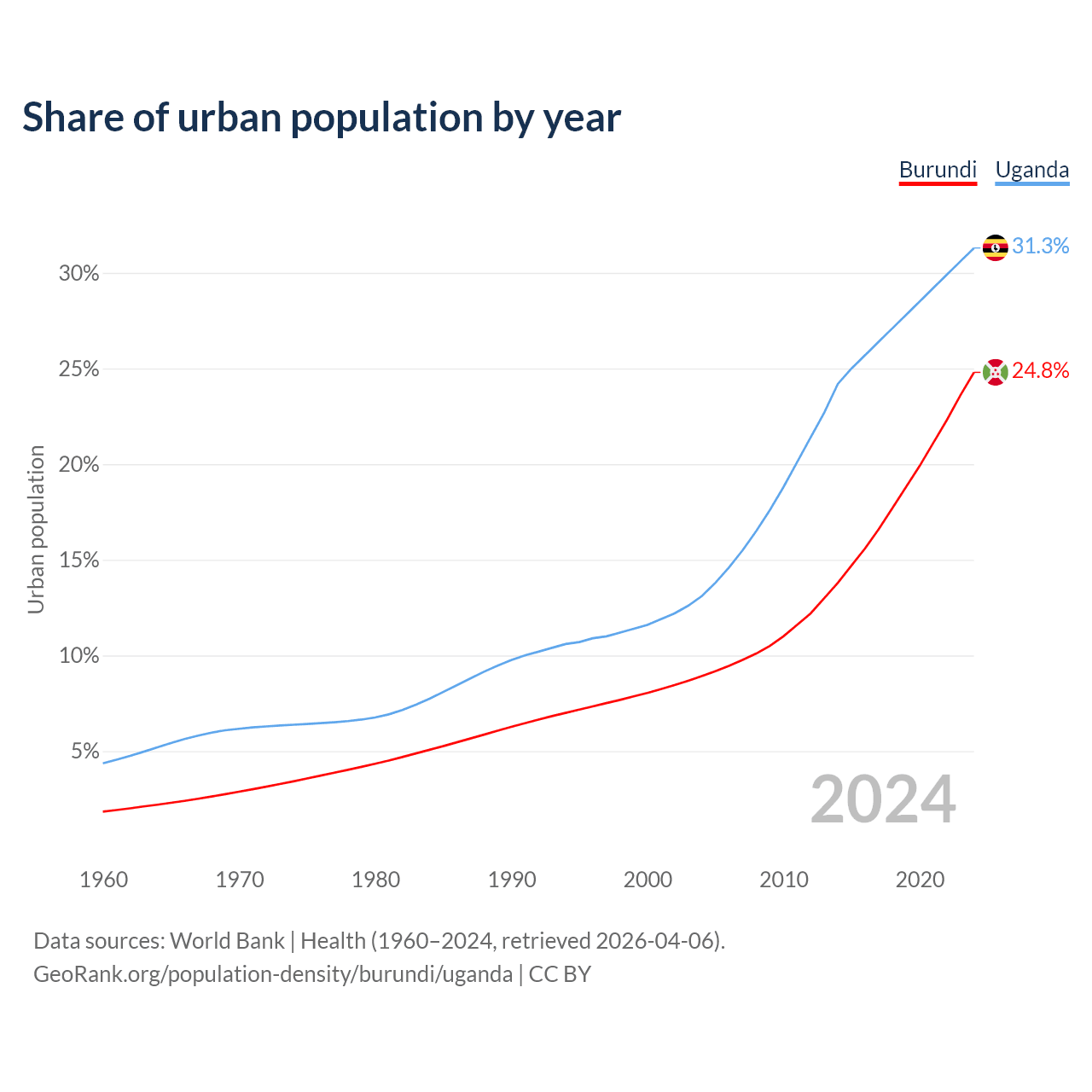 From 2004 to 2024, the share of urban population changed from 8.92% to 24.8% in Burundi and from 13.1% to 31.3% in Uganda.