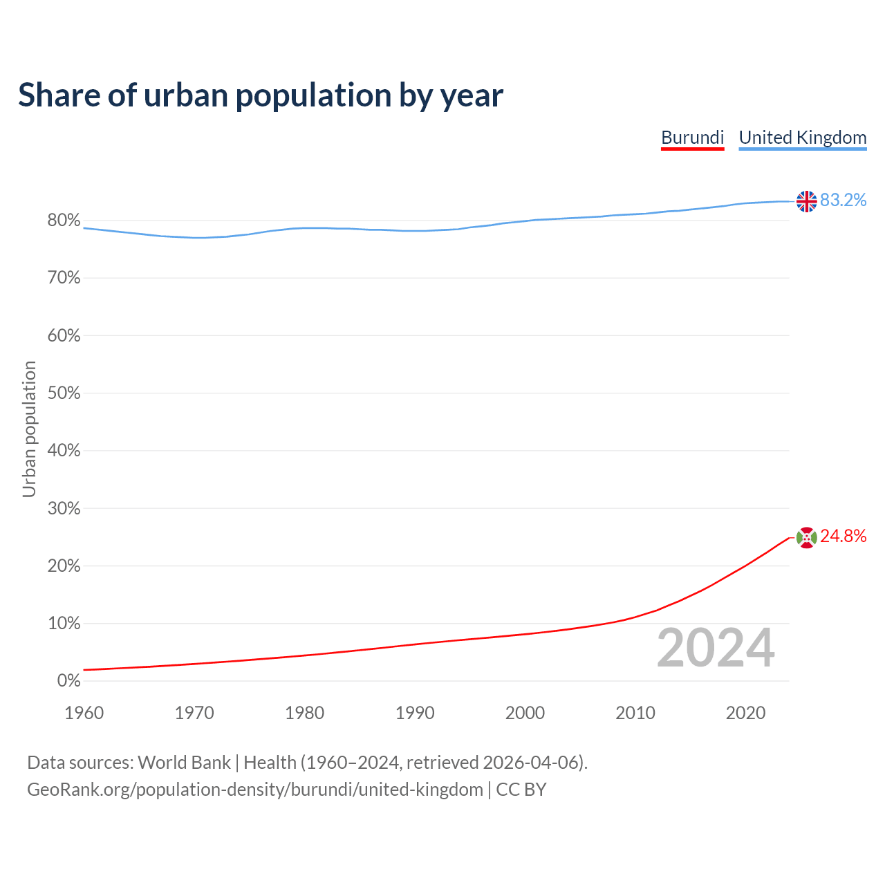 From 2004 to 2024, the share of urban population changed from 8.92% to 24.8% in Burundi and from 80.3% to 83.2% in the United Kingdom.