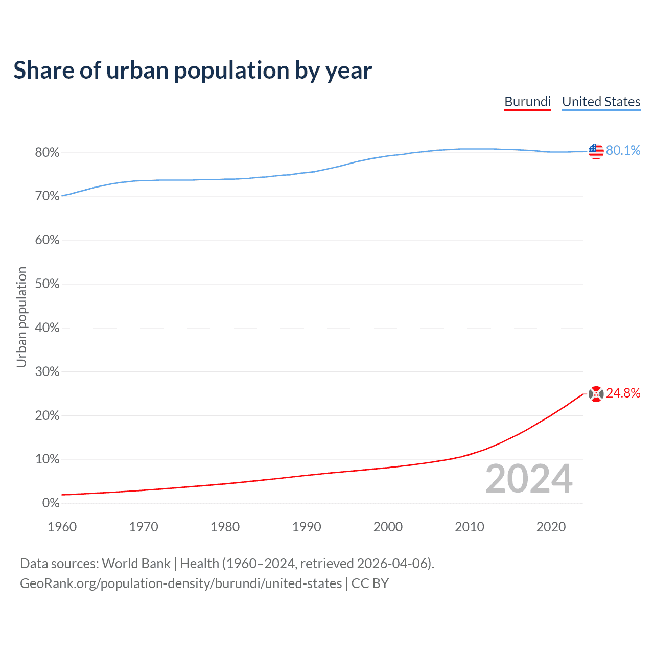 From 2004 to 2024, the share of urban population changed from 8.92% to 24.8% in Burundi and from 80% to 80.1% in the United States.