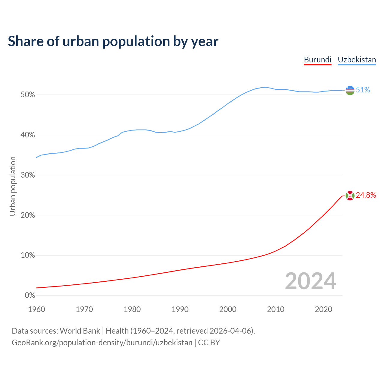 From 2004 to 2024, the share of urban population changed from 8.92% to 24.8% in Burundi and from 50.6% to 51% in Uzbekistan.