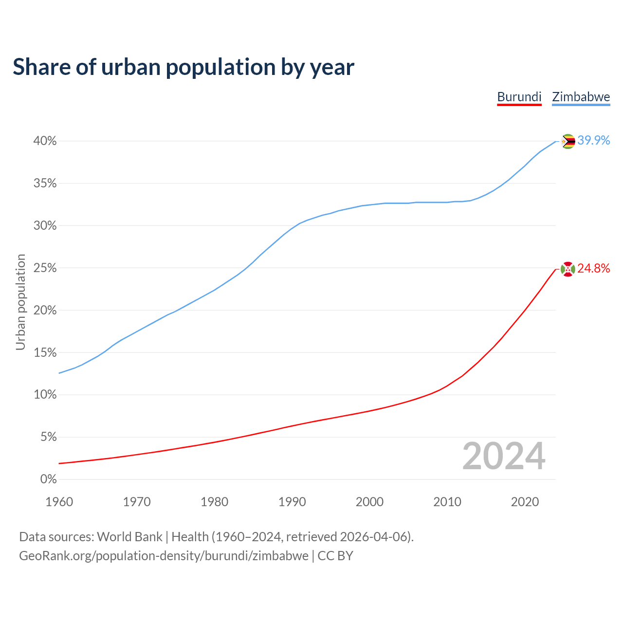 From 2004 to 2024, the share of urban population changed from 8.92% to 24.8% in Burundi and from 32.6% to 39.9% in Zimbabwe.