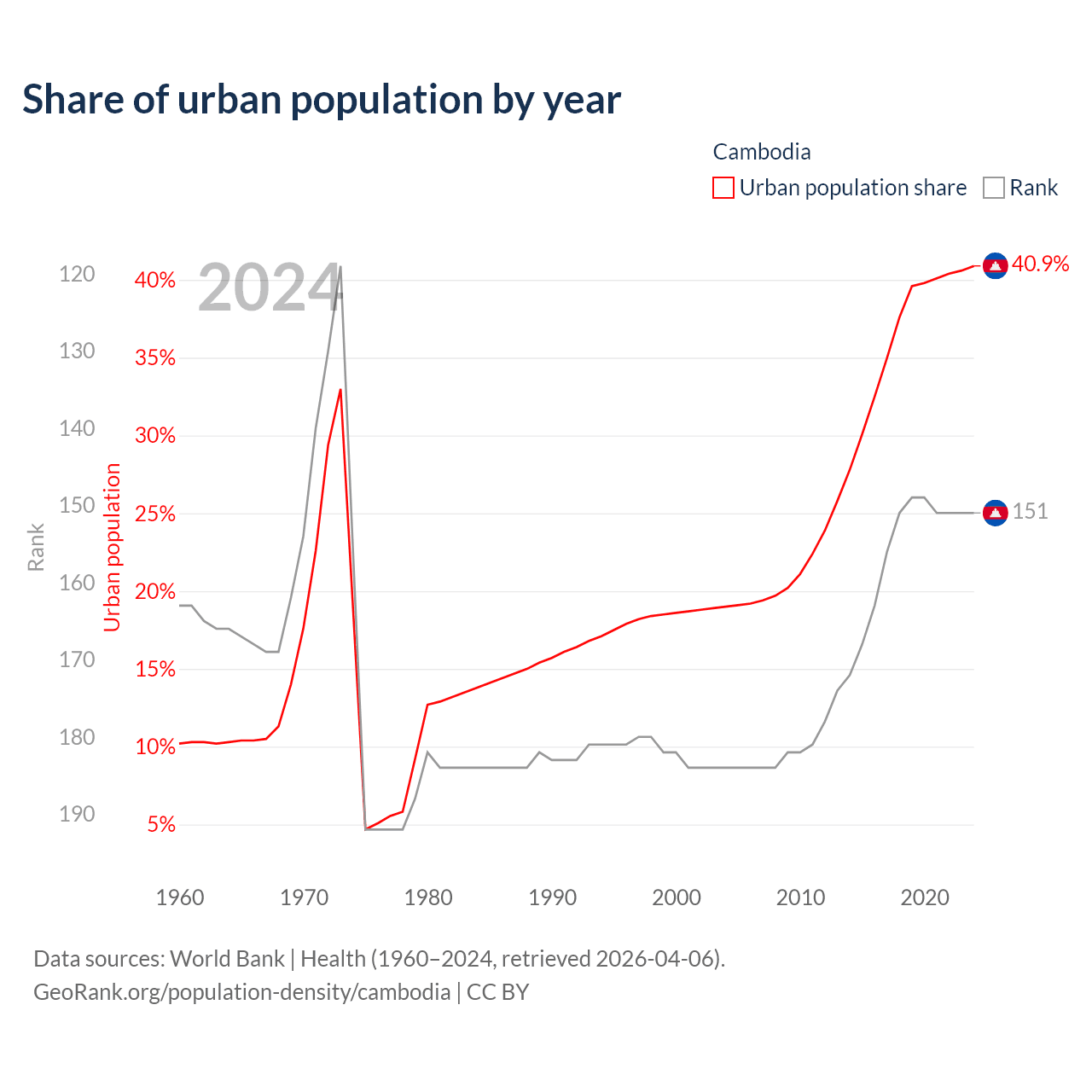 This chart shows the share of urban population in Cambodia from 1960 to 2024: 10.2% lived in urban areas in 1960, 18.6% in 2000, and 40.9% in 2024.