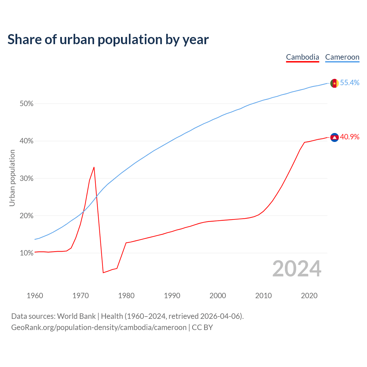 From 2004 to 2024, the share of urban population changed from 19% to 40.9% in Cambodia and from 48.2% to 55.4% in Cameroon.