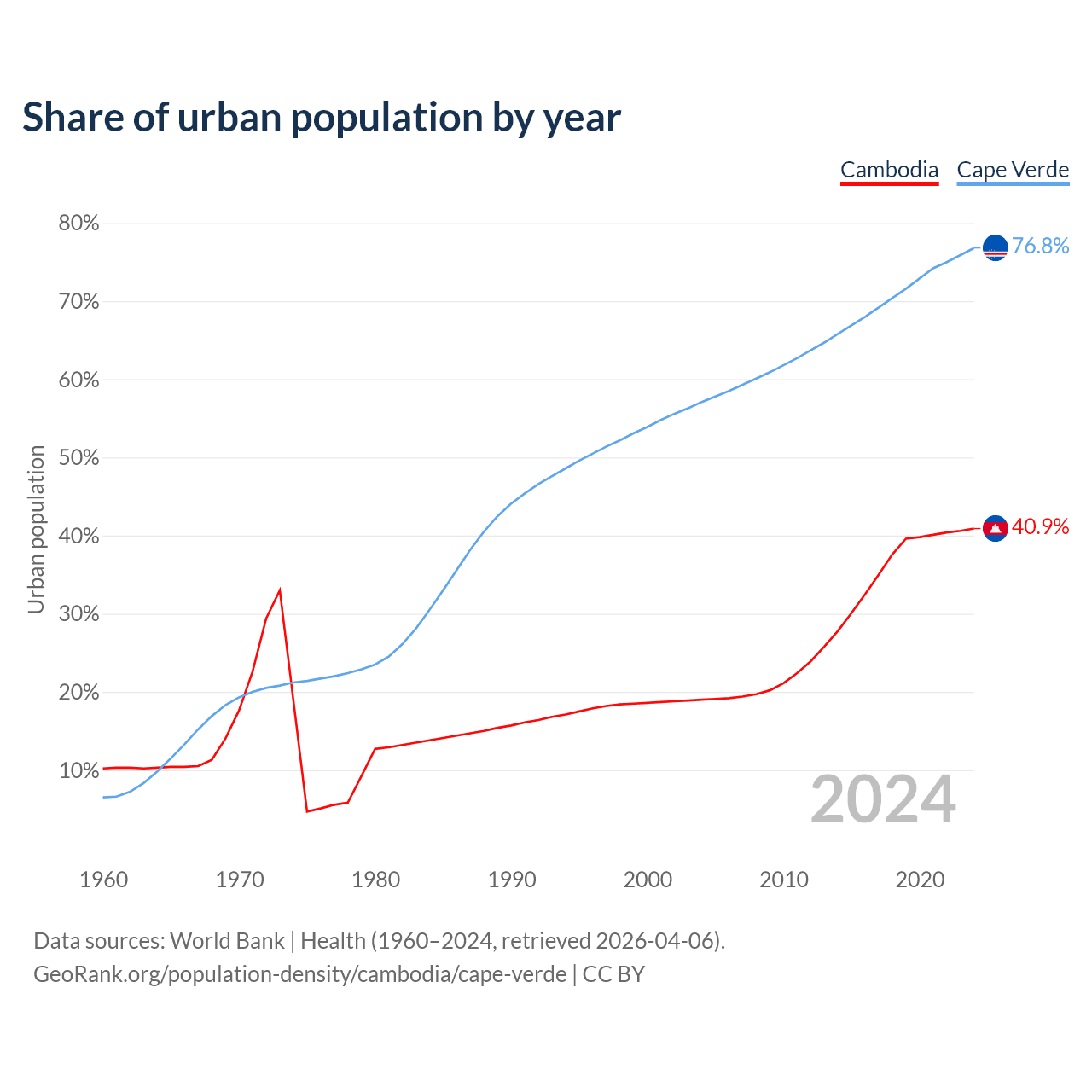 From 2004 to 2024, the share of urban population changed from 19% to 40.9% in Cambodia and from 57.1% to 76.8% in Cape Verde.