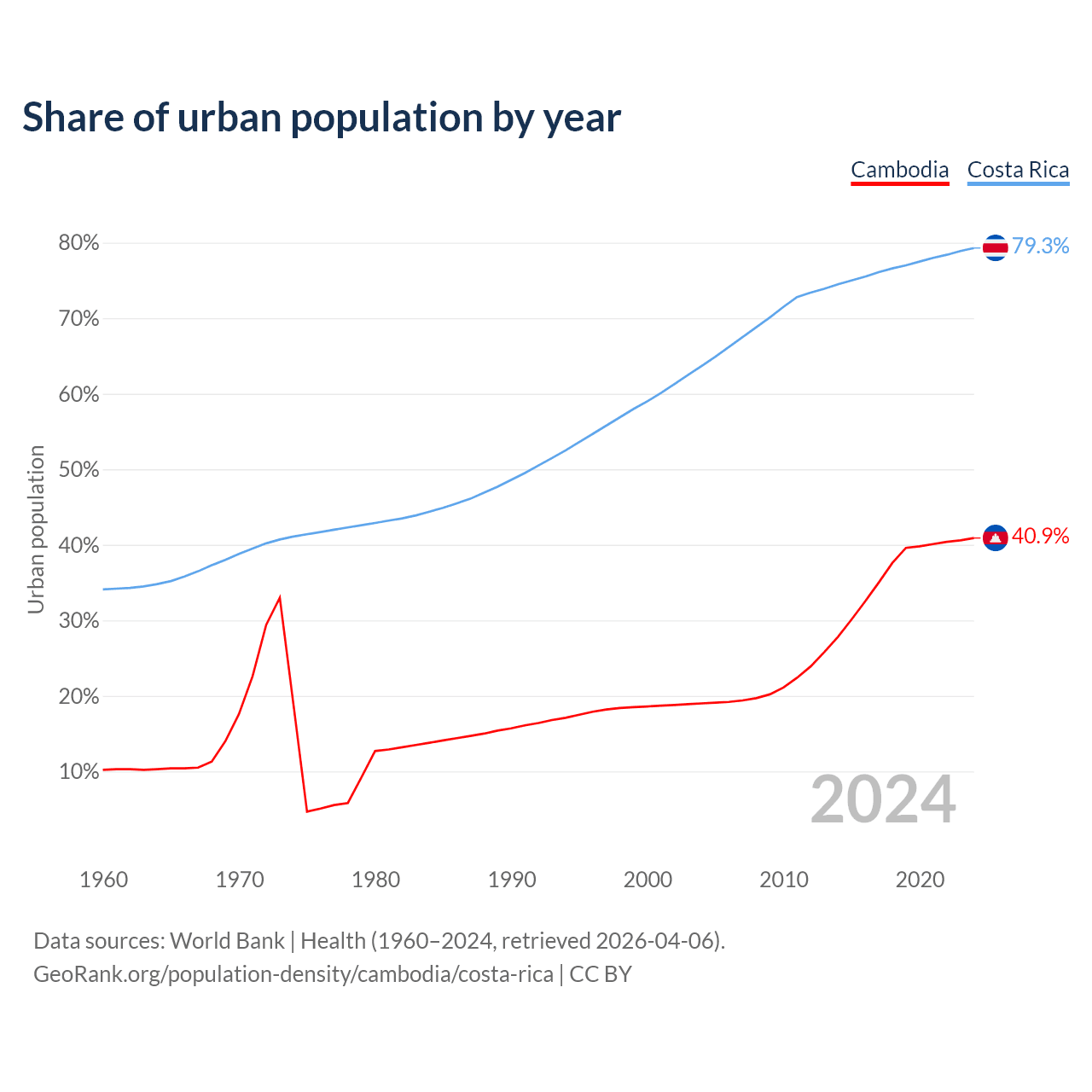 From 2004 to 2024, the share of urban population changed from 19% to 40.9% in Cambodia and from 63.7% to 79.3% in Costa Rica.