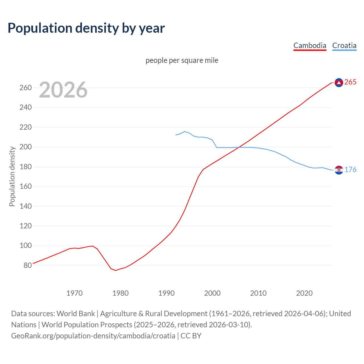 From 2006 to 2026, population density in Cambodia increased by 32.4%, compared to a 11.6% decline in Croatia.