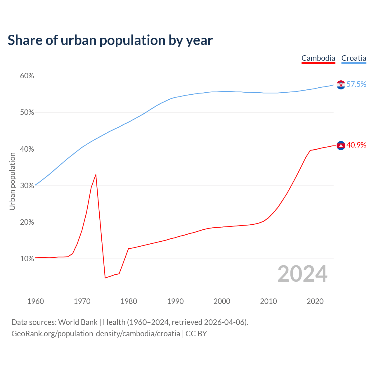 From 2004 to 2024, the share of urban population changed from 19% to 40.9% in Cambodia and from 55.6% to 57.5% in Croatia.