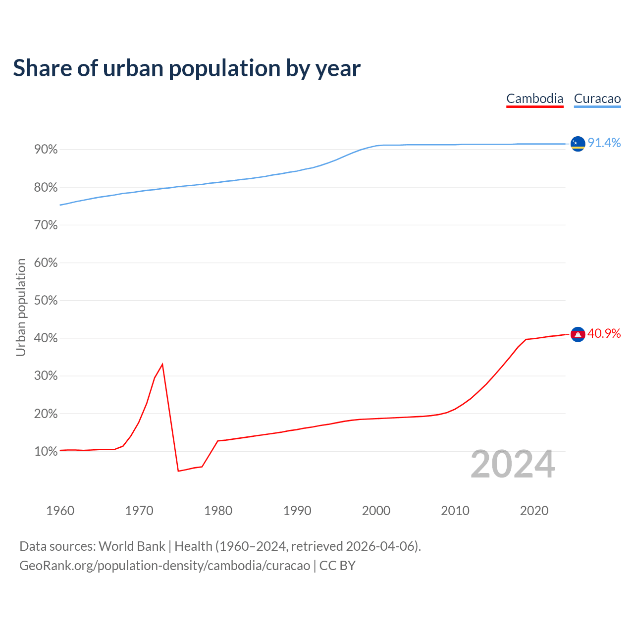 From 2004 to 2024, the share of urban population changed from 19% to 40.9% in Cambodia and from 91.2% to 91.4% in Curacao.