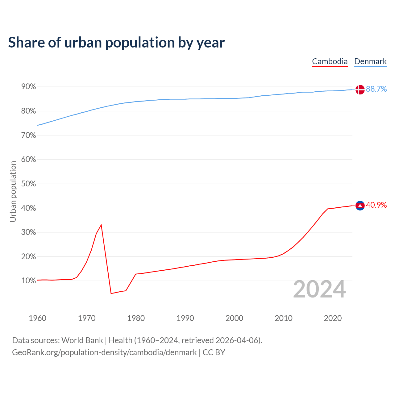 From 2004 to 2024, the share of urban population changed from 19% to 40.9% in Cambodia and from 85.7% to 88.7% in Denmark.