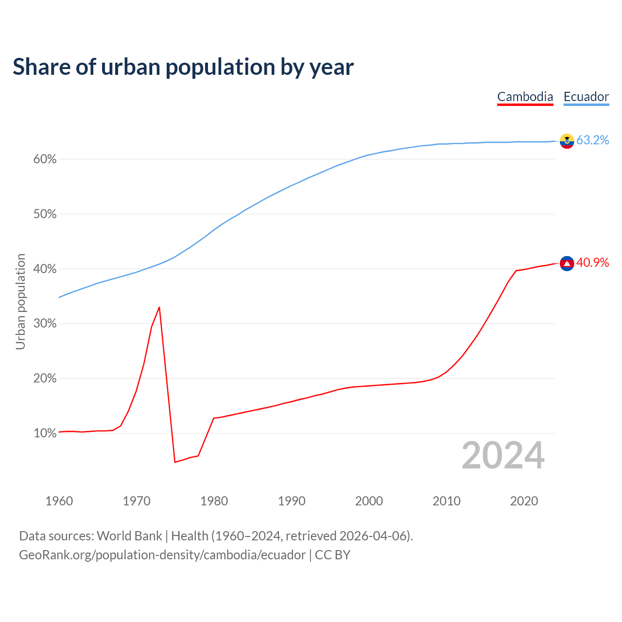 From 2004 to 2024, the share of urban population changed from 19% to 40.9% in Cambodia and from 61.8% to 63.2% in Ecuador.