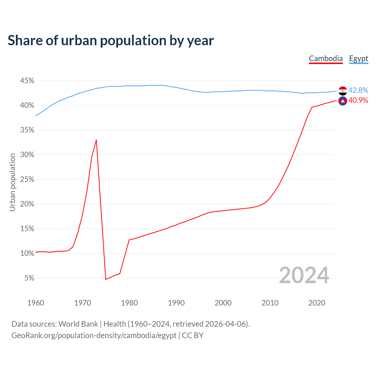 From 2004 to 2024, the share of urban population changed from 19% to 40.9% in Cambodia and from 42.9% to 42.8% in Egypt.
